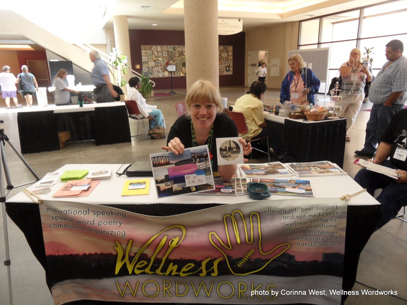 Corinna West modeling a digital poem collage during her mental health social entrepreneurship launch phase - Ricardo Lopez in Bolivia brings family, medical staff, patients, and former patients together in joint musical activity. By encouraging all individuals to participate as equals, Ricardo’s approach touches patients in a nonthreatening way. The community therapy breaks down existing vertical relationships, opens patients up to other therapies to facilitate recovery, and better prepares patients for reintegration into their families and society. The social-leveling effect of making music together is empowering for patients and builds self-esteem and hope for rejoining their communities. Ricardo’s approach is low-cost, easy to implement, and easily transferred across a wide spectrum of institutionalized populations. (Breaking down barriers is common for social entrepreneurs.)