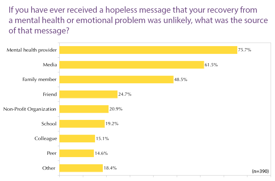 - 64% were never told by a mental health provider during their mental health care that recovery from their mental/emotional problem was possible, and 41% were actually told by a mental health provider that recovery was impossible.