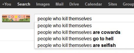 Being the parent of a dead child is hard. Being the parent of a child who died from suicide may be even harder. It seems so to me when I look at how google autocompletes for two searches – people who kill themselves and people who are murdered.