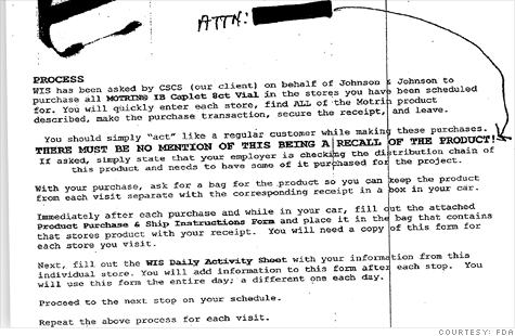 A memo containing detailed instructions to contract workers to buy up Johnson & Johnson’s Motrin (ibuprofen) from stores – discovered because one of the contractors accidentally dropped an instruction sheet on the floor of a store – instructed contractors;