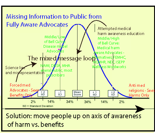 But since his community is hopeless for now, maybe we can look at language in our own community. Although we may be against much of what psychiatry is doing, saying, “medical-harm aware,” places the blame them. It points out their lack of science knowledge, and doesn’t point to us just for being against them. Â This is kinda like David Oaks’ blog on “Please Stop Staying Mental Illness,” which asks people not to use the language of the oppressor. I have an earlier post on “Please stop Saying Medical Model,“ which explains that many political battles are lost when you accept the opponents’ framing of your argument. In the abortion argument, who wants to be anti-life, or anti-choice? Â Also, if we make this request enough, maybe we can teach the disease model apologists how to be respectful.