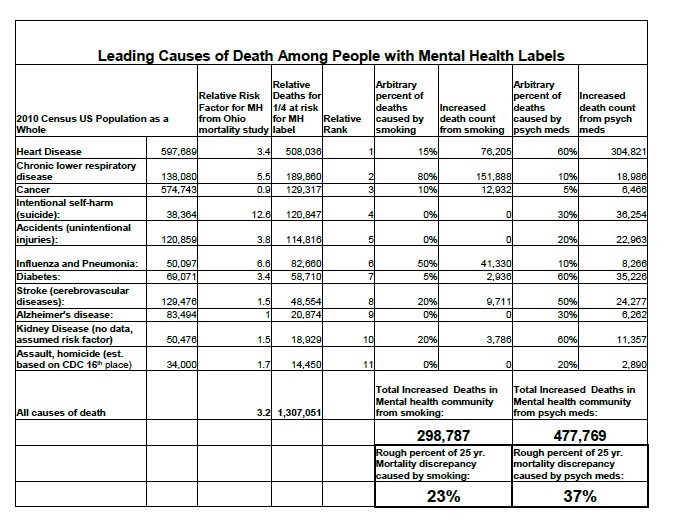 People have been doing research on social determinants for a long time. Here’s a breakdown I made to compare the impact of smoking (which many funders will address) versus the impact of psych drugs and the disease model (which few funders will address). The source for this data is explained in each column: coming from the Ohio mortality study referenced in the NASMHPD morbidity and mortality report. For the heart attack data, you can see more detailed calculations on my previous MIA Carrie Fisher blog post.